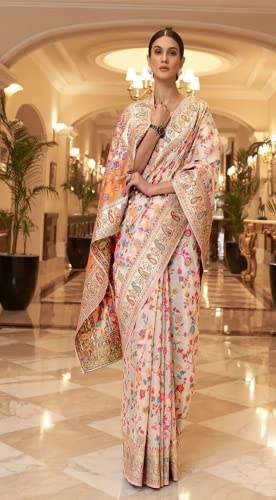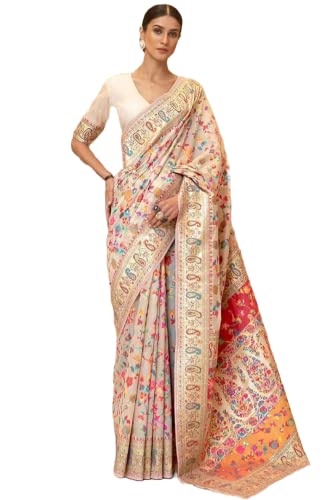Anantdiva Kashmiri Silk Saree for Women Indian Traditional Wear Saree Ethnic Wear Wedding Sari with Unstitched Blouse (White)
